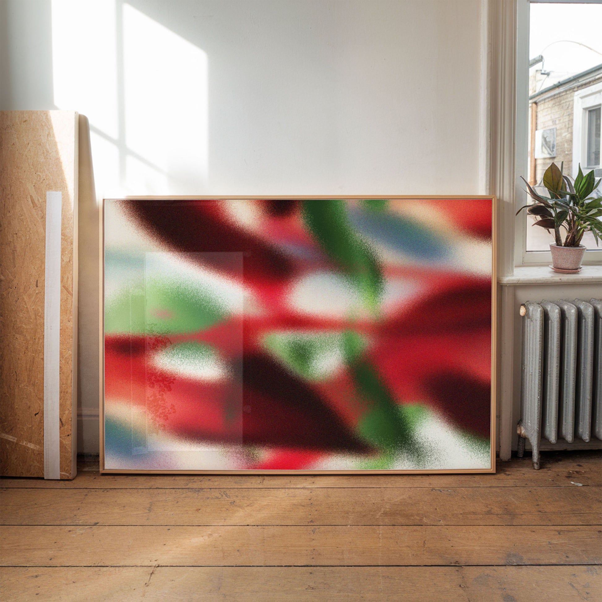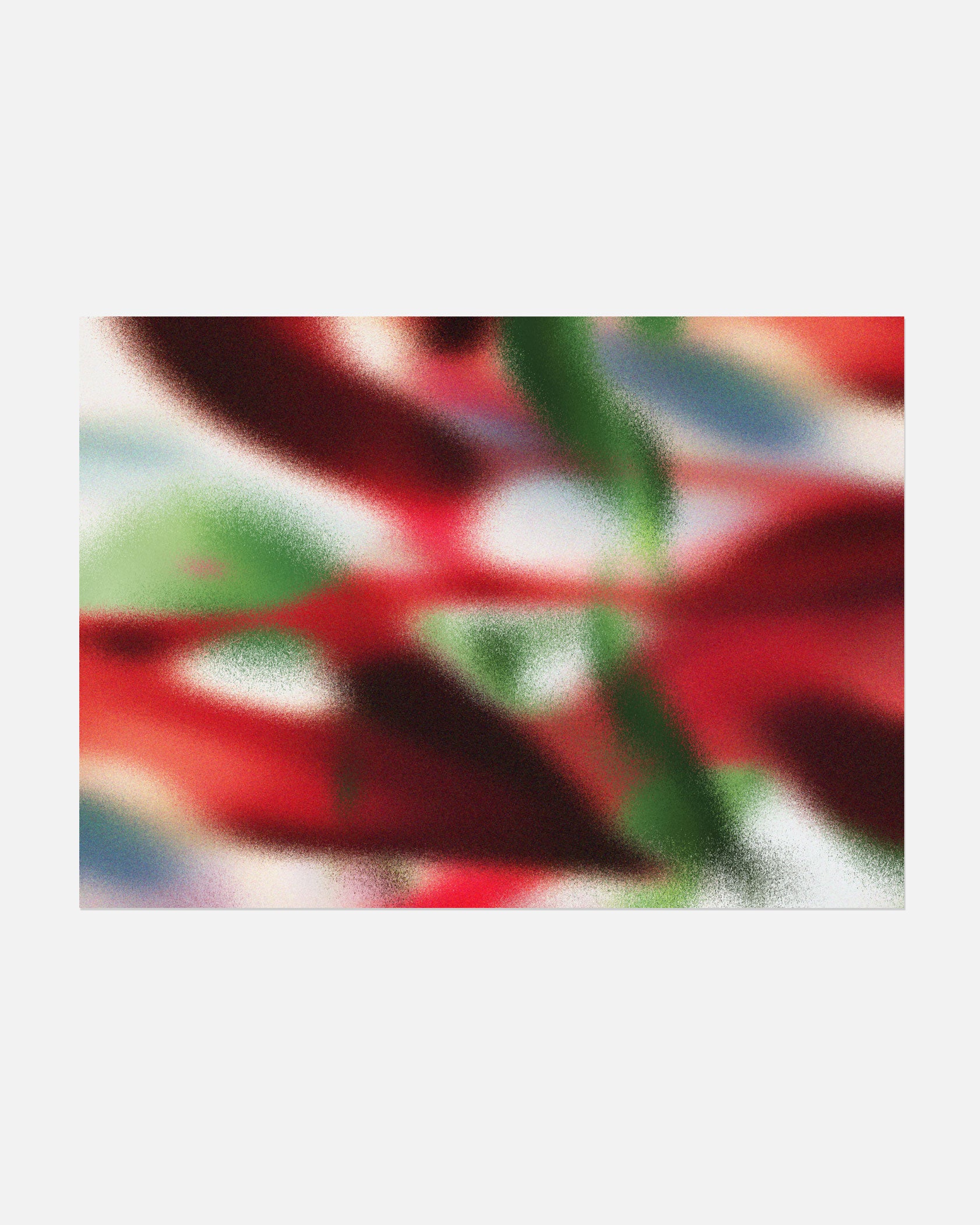 Grainy abstract floral poster in red, blue and green tones.